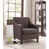 This arm chair is upholstered in quality chocolate fabric that’s made to look great. The solid wood frame ensures a lasting build, while the thick padding inside the chair brings a warm cushioned feel.