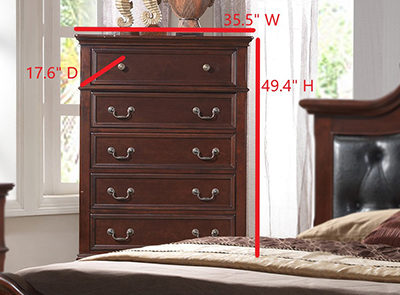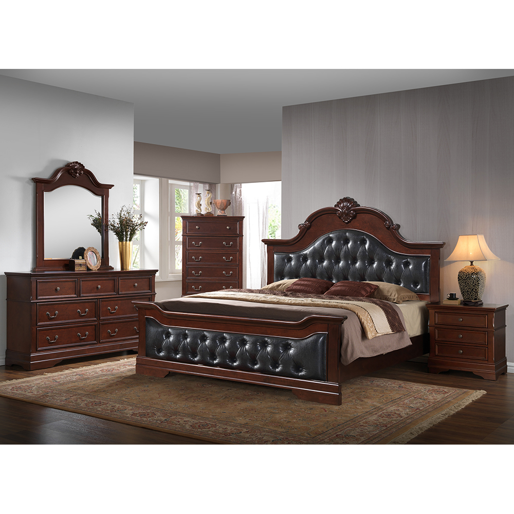 The top carvings on the headboard, vinyl upholstery and antique brown finish of the Melville Bedroom Collection brings stately tradition to your space. The solid birch and veneer construction give this set old-fashioned strength while the brass drawer handles smoothly pull open the wide spacious drawers.