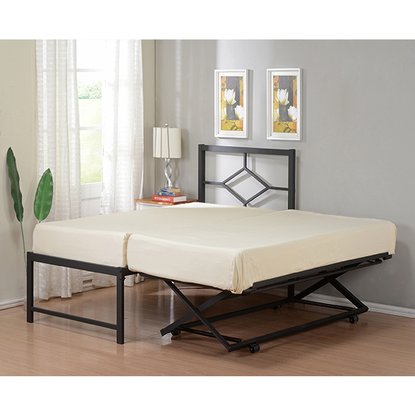 The Armada Hi-Riser Bed features a platform with thirteen metal slats for support, eliminating the need for a box spring. The all-steel frame ensures long life and safety, while the clean open design in a black or white finish will match any decor. The two trundle beds available, pop up and drawer style, slide easily beneath the daybed, and can fit mattress up to 11″H.