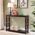 Cutting clutter while providing a platform for accent pieces, photos, plants, and more, console tables are a must-have in any home. Crafted from a blend of solid and manufactured wood, this piece boasts a dark cherry finish and features geometric latticework on each side for a touch of contemporary appeal in your abode. Its tabletop strikes a rectangular silhouette, while the bottom shelf saves space for even more storage.