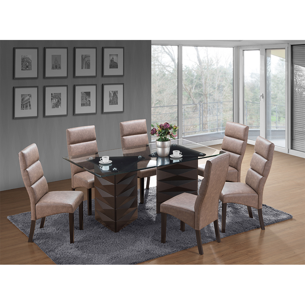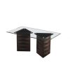 The Bronford Dining Table features a clear glass top upon two triangular solid wood pedestals for modern beauty. The table is wide enough to seat four people, and the cappuccino finish adds a touch of tradition.