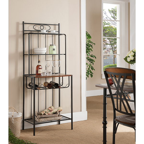 Create a tasteful storage solution for your kitchen or dining area with this baker’s rack constructed of durable wood and metal. Its neutral black and ash wood finish complements any color scheme. Features four shelves for extensive storage plus a small wine rack underneath the center wooden shelf for stylish storage of up to 5 bottles.