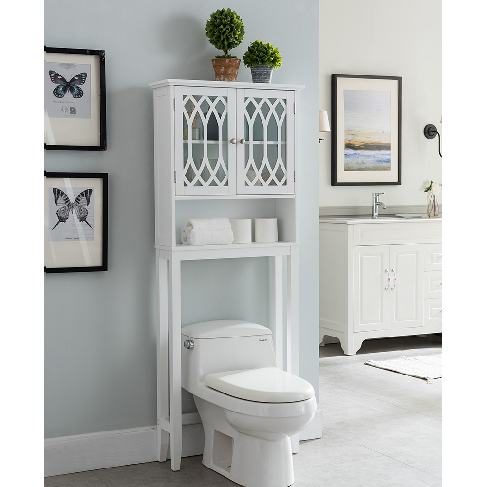 The Newberry Storage Cabinet’s fancy glass doors bring a stylish storage solution to your bathroom. A marble veneer top makes for a beautiful display, while a wide drawer and a double door with two adjustable shelves inside give fashionable storage.