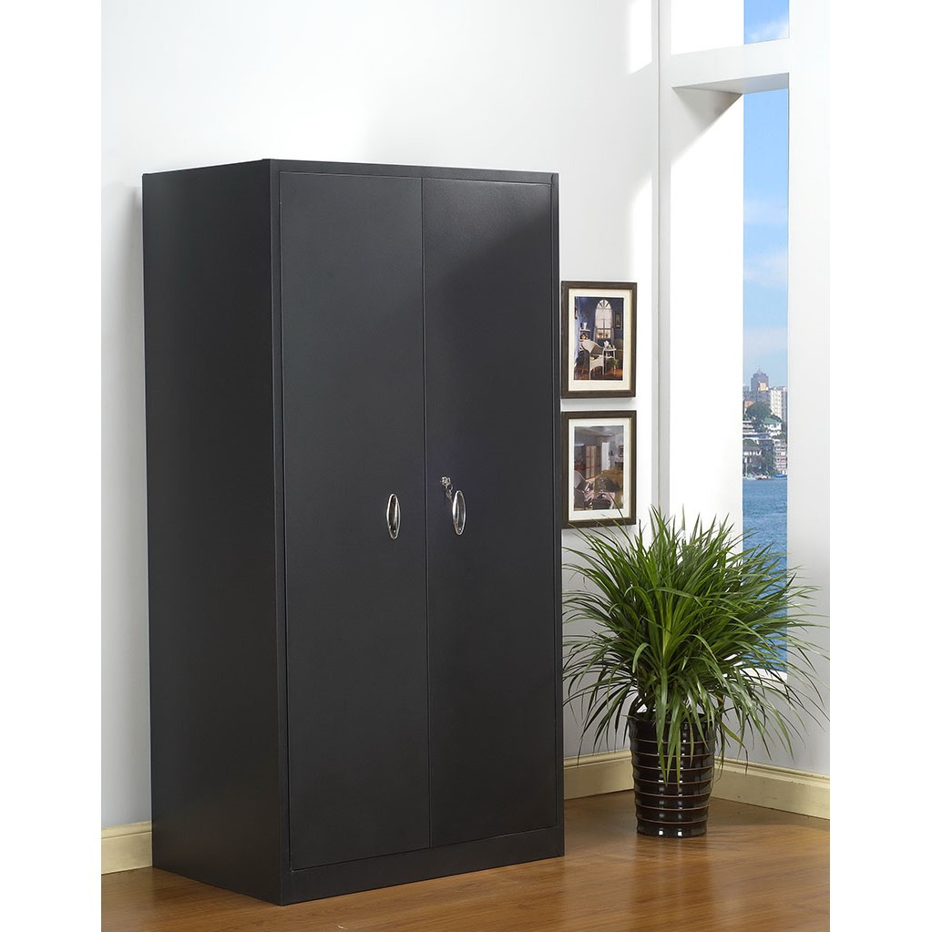 Recessed finger pulls replace the usual flimsy knobs for added durability, while three shelves and a hanging rack holds shirts, suits, towels and more.