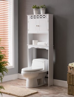 White finish wood over the toilet bathroom space saver storage cabinet.