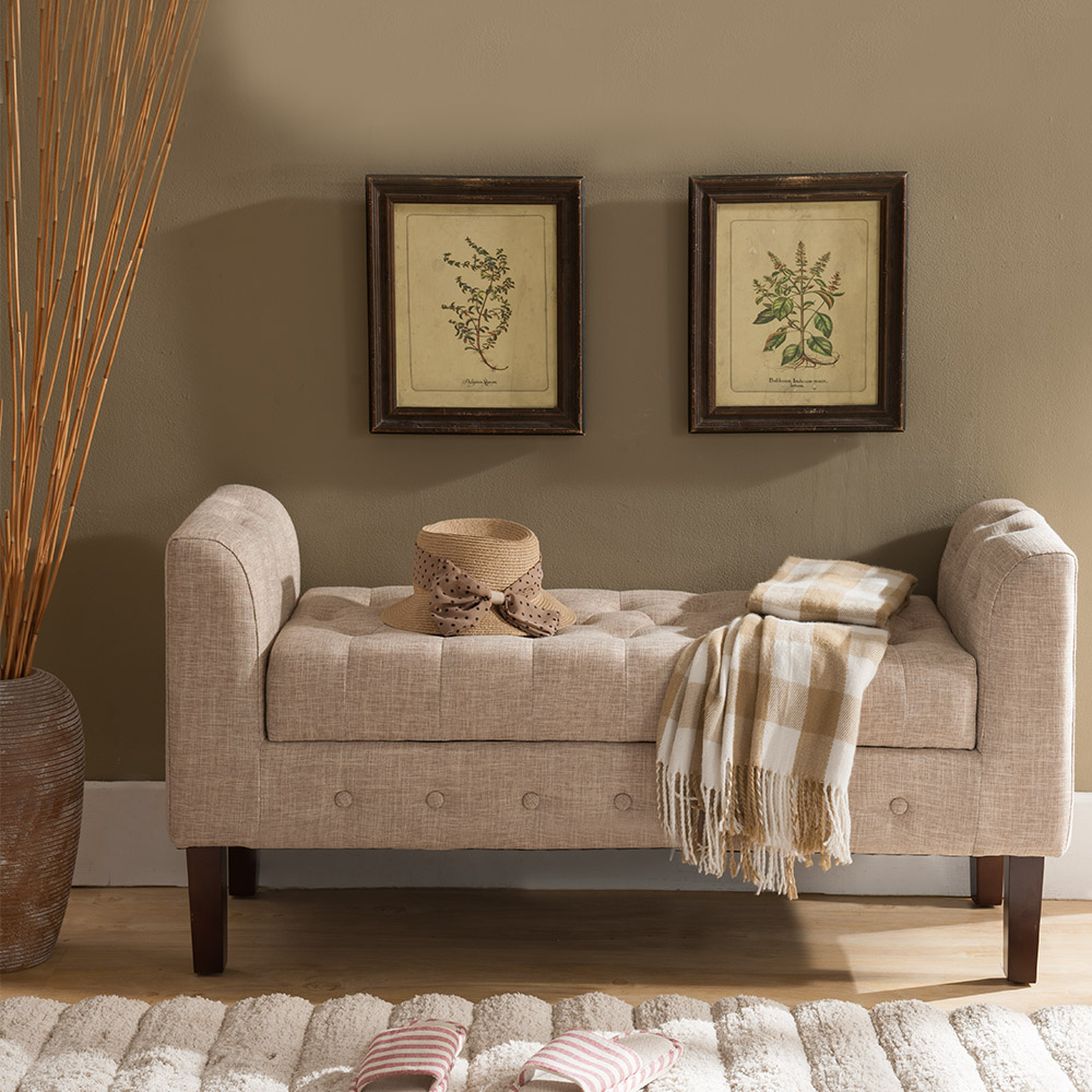 The Marceille Microfiber Storage Bench works well in a foyer, living room, or bedroom. Comfortable foam padding, upholstered in neutral brown fabric with button tufted details, gives upper-class style and comfort, while the hinged seat reveals open storage for blankets, shoes and more.