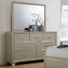 The Tuscola Dresser, constructed of wood in a sleek silver champagne tone finish, brings charm and elegance to a bedroom. Mirror trim accents complete the luxurious modern look, while the available matching mirror tops it all with outstanding style.